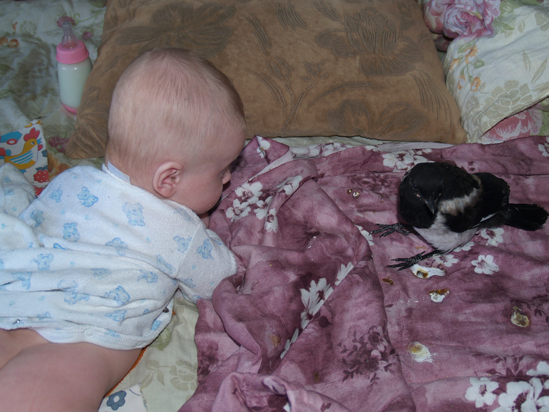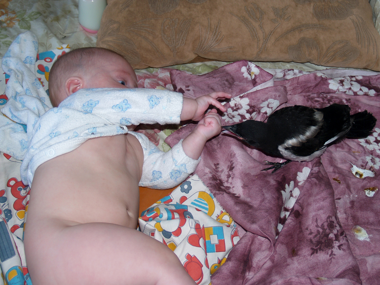 Мы в свое время ворону подобрали. Ее отвели к врачу всю опрыскали т.к. в ней много паразитов было.( В ветаптеке продают спрей от паразитов для птиц). Еще очень опасно если она перепутает палец с едой или глаз. Моего мужа ворона схватила за палец и мы еле разжали клюв. Укусила до крови.(Они клювом палки ломают и черепа крысам). Фотки конечно прикольные,но я бы тоже не подпустила такую опасную птицу к ребенку. У нас жила на кухне т.к. боялись кошку или собаку долбанет клювом.