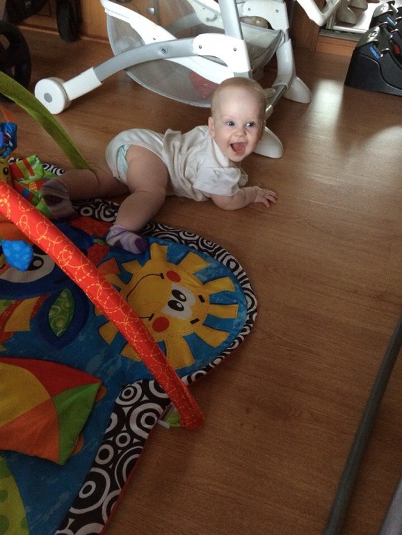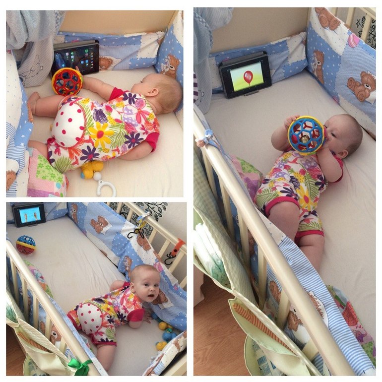 За последние пару недель Леся стала до ужаса деятельной и активной. Уверенно становится на четвереньки при любой возможности, вертит жопкой и пытается ползти. Пока что в совершенстве освоила ползанье задом наперёд. Вперёд тоже периодически получается, но пока что не так успешно. Активно пытается сесть, но это получается ещё хуже, чем ползти вперёд) Сейчас вожу её на массаж, посмотрим что это даст и какие успехи будут к концу курса. Очень полюбила мульт от Tiny Love, может подолгу в него залипать.