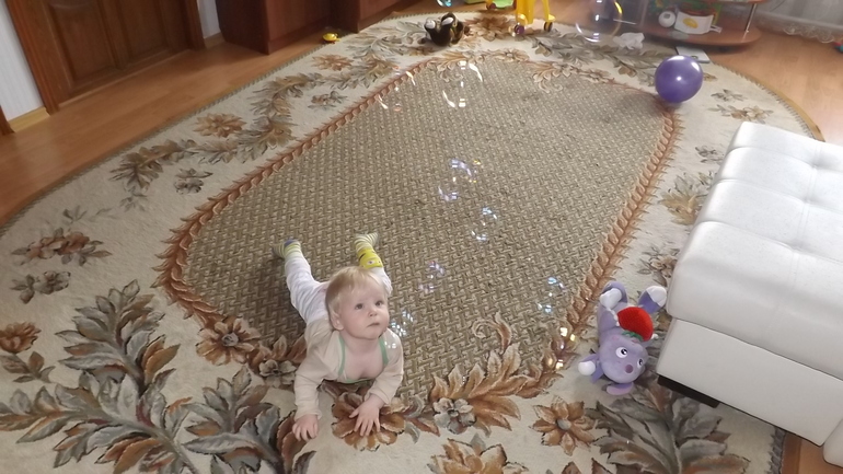 очень нравятся мыльные пузыри, смотрит, как завороженный, смеется.