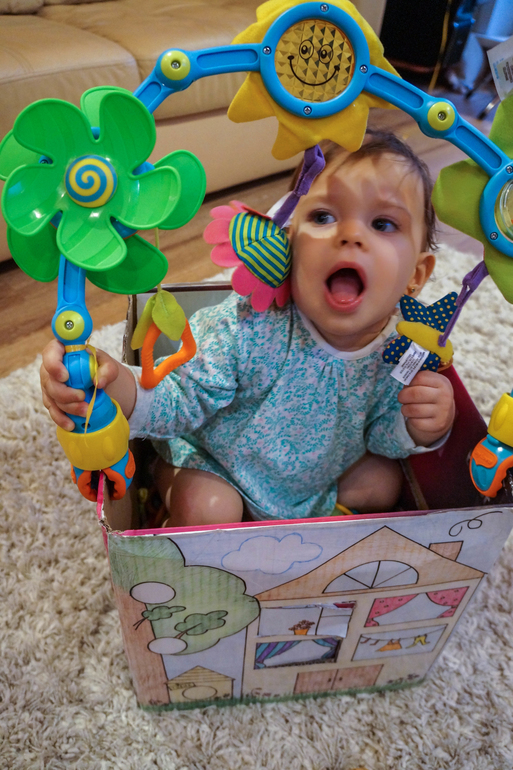 Вообще коробка чудесная - она в нее и залезает, и складывает в нее свои мягкие игрушки и катает их по дому))