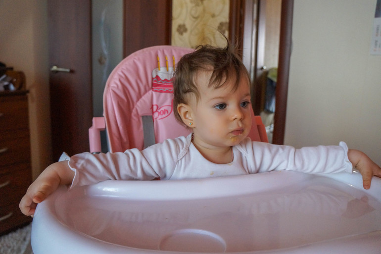 Кушает важно обхватив руками стол. За ложкой не тянется, если поставить перед ней тарелку, то тут же переворачивает ее или скидывает на пол.