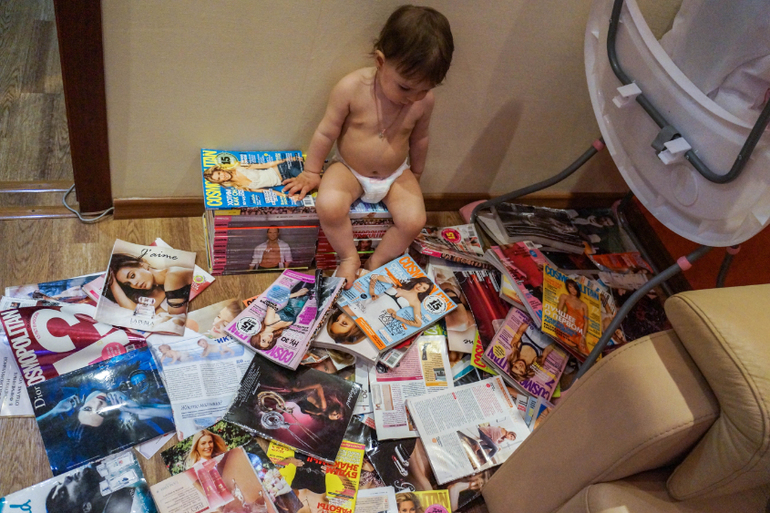 Марьяша любит складывать разные предметы в коробки и носить эти коробки по всей квартире. А недавно зашла в зал и увидела такую картину: