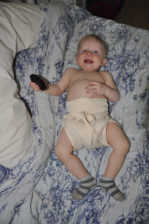 2.Вот реально сухие снаружи, био марля принимает весь удар на себя, трикотажный подгуз может лишь иногда намокнуть внутри, но не снаружи, а если сверху нацепить их же шерстяные штанишки, то вообще хоть зимой в них ползай по полу.