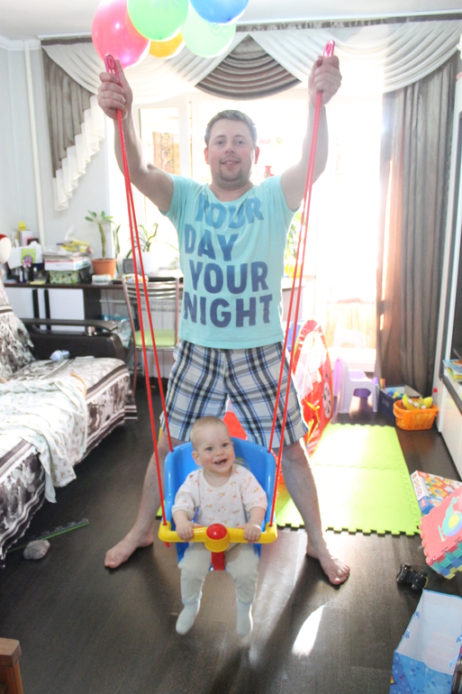 но на самом деле торт получился очень вкусным, многослойным. Потом приехала сестра у мужа и мы провели с ней целый день, гуляли, спали, в общем, как обычно. После пяти пришёл муж, моя мама и её муж. По нашему заказу Максимке подарили детский коврик, палатку в виде машинки, ну и бабушка не удержалась и купила пару маленьких машинок и мозайку для малышей. После того как ушли гости мы с мужем приподнесли коронный подарок - качель. По личику Максима видно, что ему очень понравилось.