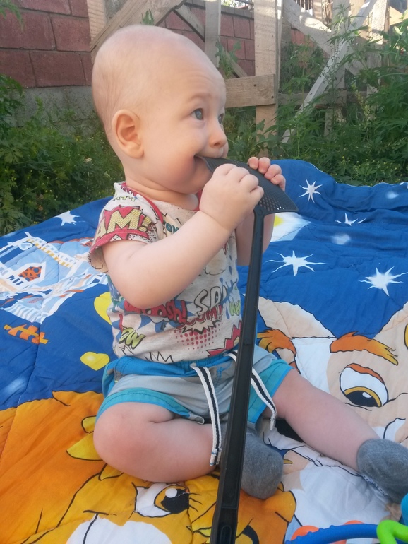 Зубов до сих пор нет, ну и ладно)) кушаем когда как, обычно завтрак каши, обед овощи. Бывает только сиську кушаем. В общем коротко о главном так сказать, потому что времени ноль, шило в попе у нас то еще. Ну и пара фото))