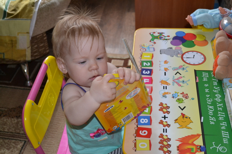 За последний месяц очень много всего стала делать: включает телевизор пультом, научилась слезать с дивана, пока плоховато, но технику уже поняла, танцует под песню из рекламы "Gloria Jeans", даже из кухни если слышит её, сразу улыбается и в ладоши хлопает)))) Пинает ножкой всё подряд, особенно мячики, пытается попасть фигурками в дырочки сортера, пока не получается))) Слова : мама, папа, баба, тить (титя), тоть (цветочек), кх (киса), ням, да. Знает слово "нельзя", сразу бросает то что в руках держит))) Сися до сих пор в почёте у нас, в любое время любимое дело)))