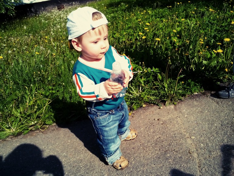 Из физического развития... Ой, ожидаемо для нас. Мы пошли в 9 месяцев и 6 дней... До этого мы, напомню, встали в 5,5 у опоры, а с 7 месяцев вставали где ни попадя. В 9 месяцев я начала водить Дениску с руку. За одну руку. И не прошло и недели, как он сам решил сделать свой первый шаг. Теперь мы бегаем... Ух, топотун - только успевают за ним. Везде теперь брожу за ним хвостом - углы в квартире всюду же... На улице в городе боюсь, но тихонько начинаю отпускать. На даче бегает сам - в траву мягко приземляться)