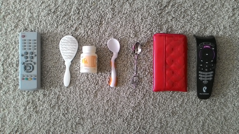 прям наш наборчик :) мы кстати помыли и отдали два старых пульта так все равно как ходить стал наши тырит :) а баночку из под витаминок уже по другому использует,он теперь туда ложку вставляет а раньше тоже гремел :) ну и слабость папин телефон (он его балует так иногда включает музыку и дает ему) и носки,а теперь еще и футболки,наденет на голову и бегает по квартире :)
