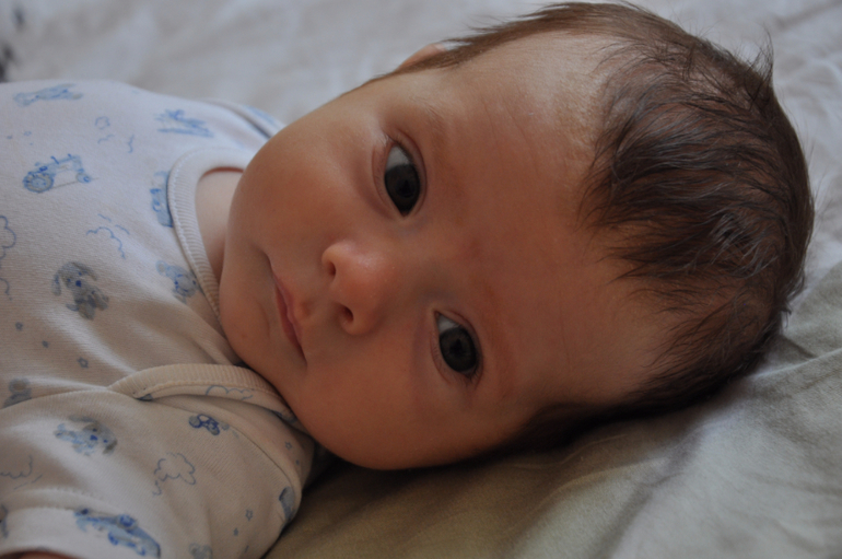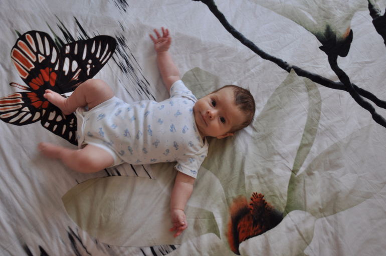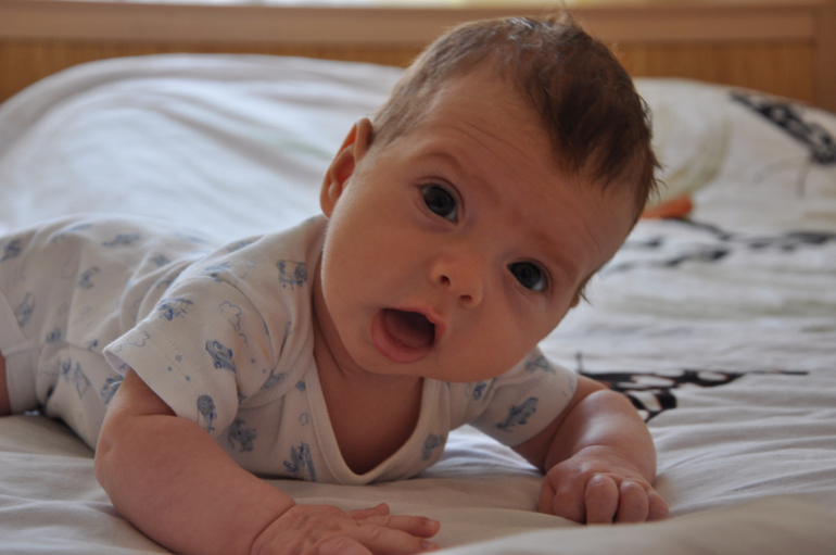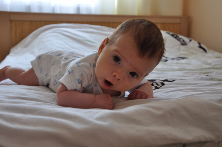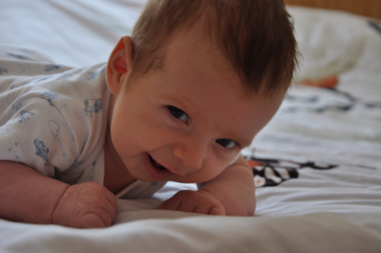 Марк стал регулярно улыбаться в ответ на улыбку или смех, и сам как будто смеётся только без звука), стал пробовать свои кулаки на вкус)) бьёт по игрушкам и хватает их уже) Активно гулит и издаёт разные смешные звуки, также следит за игрушками, больше нравится яркие цвета: жёлтый, оранжевый и салатовый, также активно держит голову и упирается на локти, переворачивается с животика на бок, а потом на спину когда устаёт лежать на животике, также активно плаваем в круге. И спим по 5-6 часов за ночь,ттт))