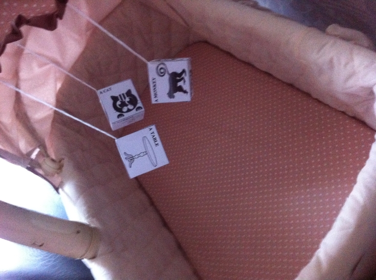 Сделала для своей малышки кубики с черно-белыми картинками и повешала их вместо стандартных игрушек. как мне кажется, смотрится отлично, да еще и полезное для развития зрения от 0 до 3 месяцев (фото ниже).