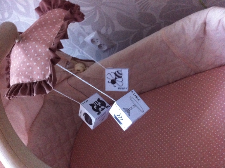 Не сочтите за критику, но, как по мне, визуально, рисунки и буквы маловаты. ( у меня дочка как раз на буквы больше любит смотреть — ее привлекали до 3 мес. буквы по размеру больше 2 сантиметров). Я тоже делала кубики (но цветные, на постарше) на мобиль, но больше нравились журавлики-оригами. Мне кажется до 3 мес. нужно активно смотреть, потому часто вешала на бортик кроватки кусок ткани (одежды) с крупным рисунком. ,Еще нравилось смотреть через тюль (она у нас с крупными дырками). так же любили смотреть на ночник (3 разноцветных грибочка, при чем один постоянно меняет цвет), книжка со шрифтами (следила, когда я буквы называла). Очень нравилось случайно надеть колечко от пирамидки на руку — если удавалось нацепить по 2 на каждую — смеялась от души. Еще на стенку возле пеленального столика вешаю картинки (т.к. стена вообще белая)- дочь всегда рада поглазеть
