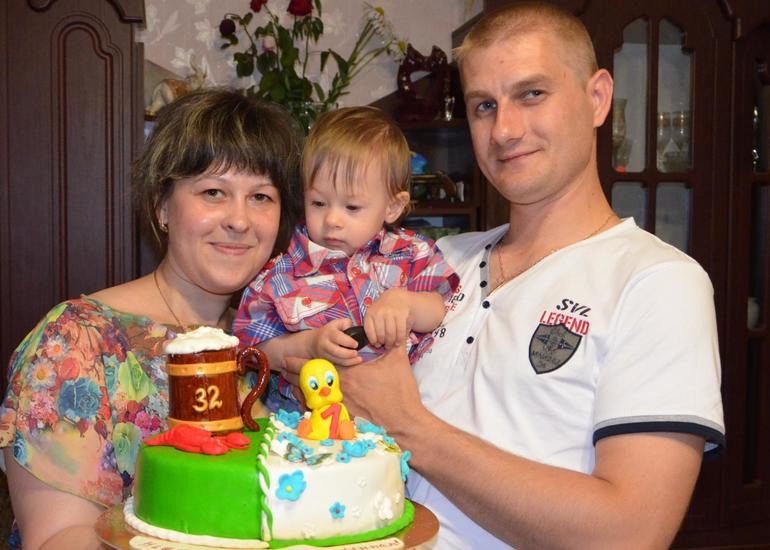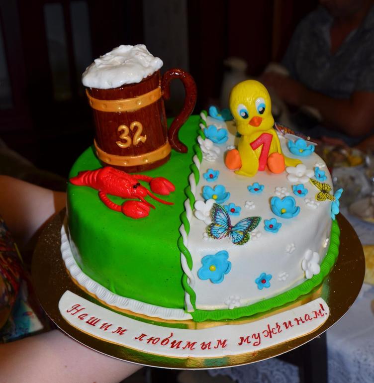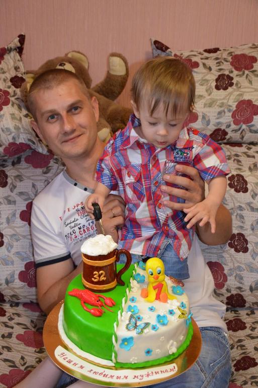 Уже годик. Наши выпускники19 июня моему сынуле исполнился годик! (А мужу 32 годика) Естественно, гостей по случаю двойного праздника было много, 16 человек взрослых и 5 детей. Я заказала именинникам один тортик на двоих .