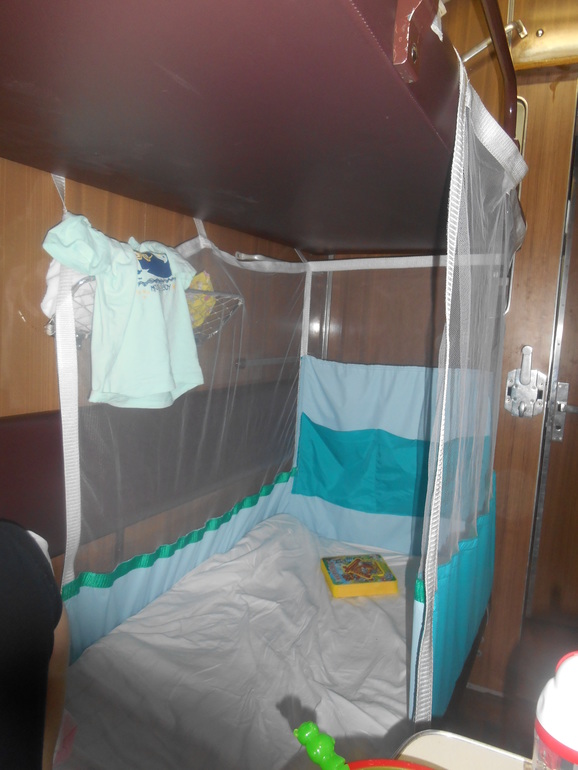 Манеж надежно крепится стропами к верхней и нижней полке. Есть шторка из той же ткани на боковую стенку (крепится на липах, в зависимости от стороны полки)