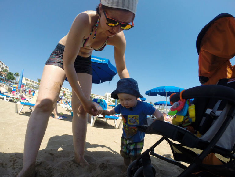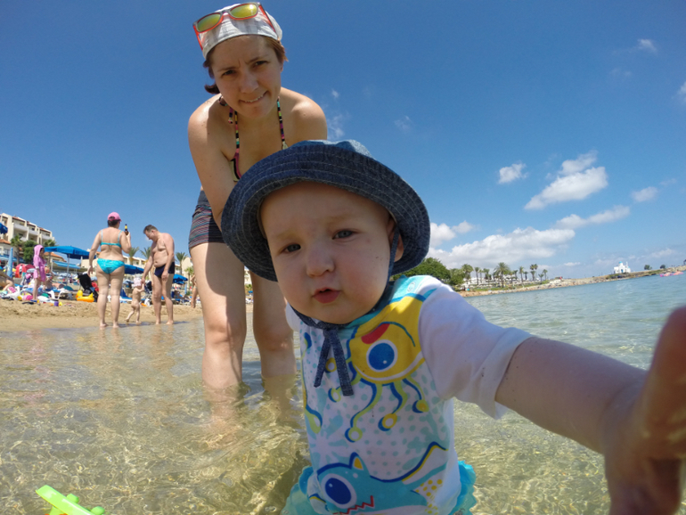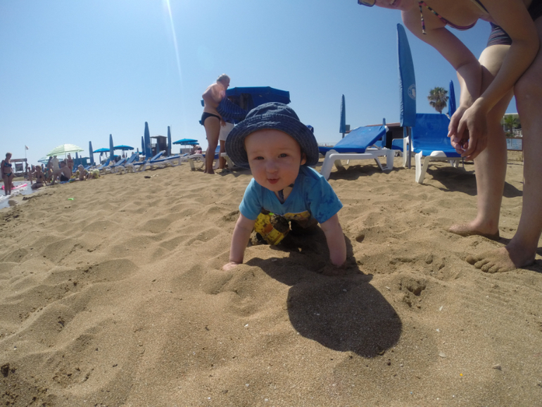 Сын был в восторге. На пляже ползал по песку, катал свою машинку (купили там набор за 3 евро, хотели там и оставить, но пришлось тащить домой))), заходил за ручку в море. Он вообще иногда подползал, брал за руку и вел к морю, типа "ну давай, пошли купаться". Купались в swimtrainer несколько раз. Особого восторга он у ребенка не вызвал.