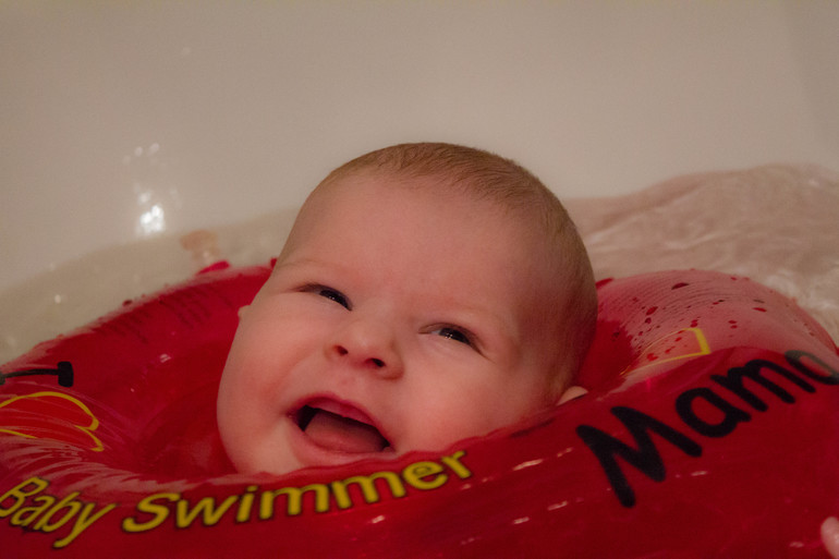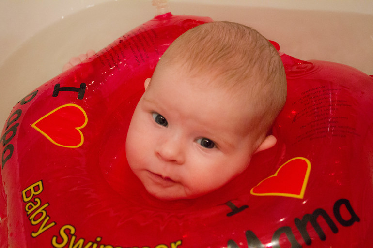 но мы с 2 недель его стали так купать, по началу то еще было "удовольствие", набираешь полную ванну, а он через 5 минут кричит, еще и одеть надо было аккуратно, чтобы сразу орать не начал. Но с упорством каждый день мы надевали и плавали)