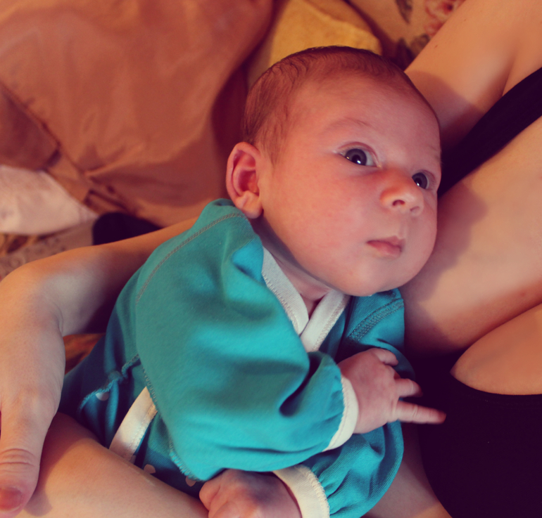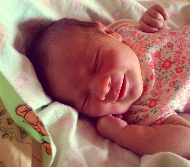 Первая осознанная улыбка нам с мужем, ровно в две недели, теперь без конца мы улыбаемся все, и Ева и я, и муж