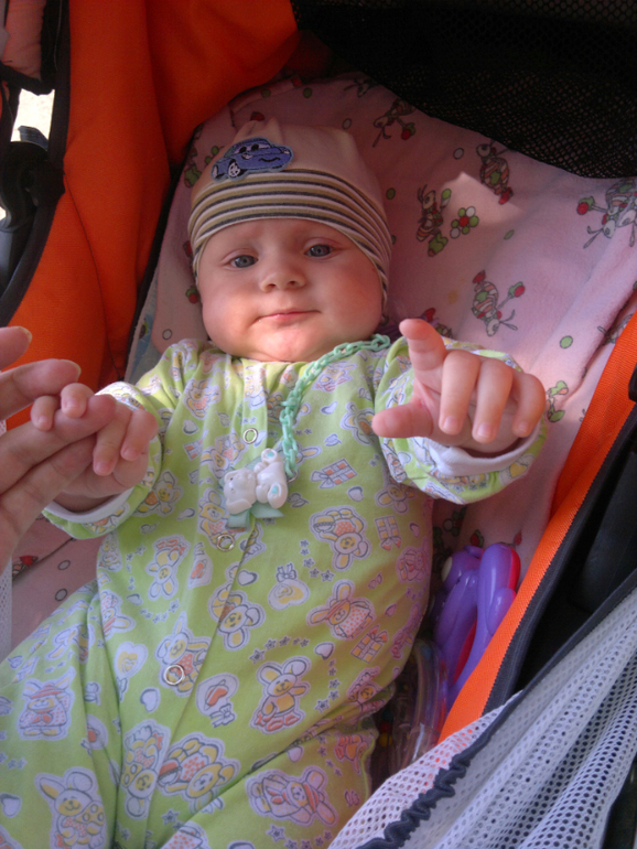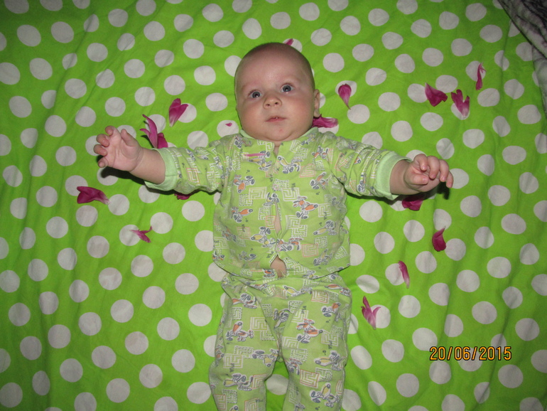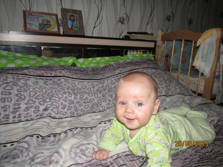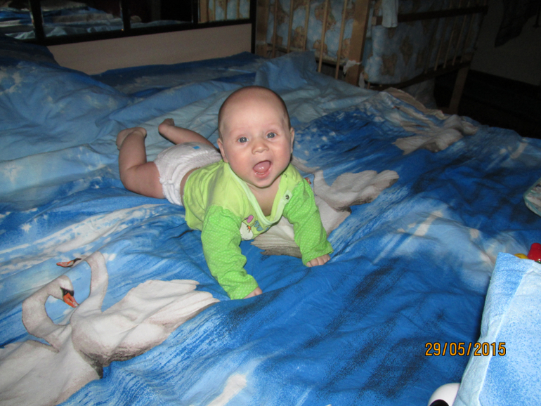 Ну вот, теперь о сыне. Радует, радует и радует))))Переворачивается вовсю)) На спине лежать вообще не хочется) На животике то интересней в 100 раз))Правда в 1000 раз интереснее, когда на животик переворачивается сразу после еды(((И все выходит наружу! Эх иногда не успеваю поймать((( А после того как перевернется, начинается ползанье ЗАДОМ по всех кровати)) У нас все ползали вперед, но мой сынок-только задом))) Вперед тяму нет, что руки надо передвигать, что ноги - есть, а вот про руки он не думает)) Ну что ж задом тоже хорошо)) Главное не проворонить момент, когда Макс решит "слезть" с кровати)) Пока "полетов" у нас не было) (слава Богу). Убеждаюсь что не зря я сыночку называла гусенечкой, когда родился, потому что ползет он как гусеничка)))