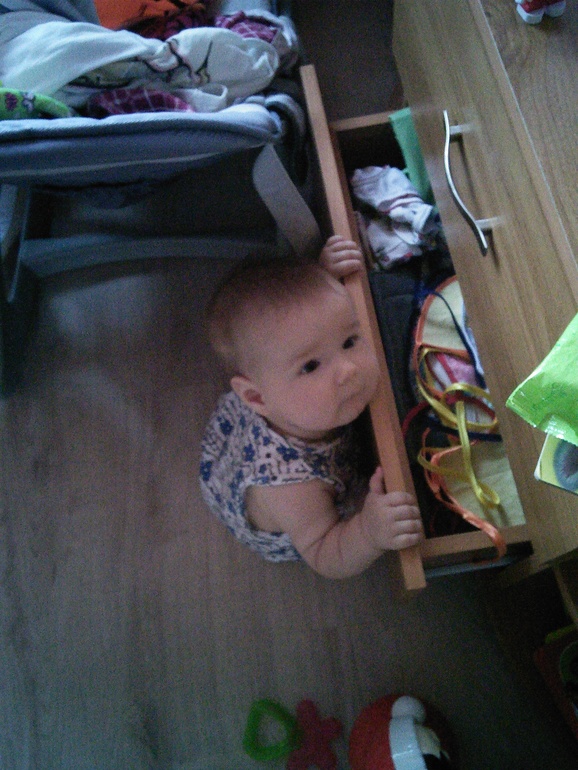 -открыла ящик тумбочки, добралась до полки у тв-тумбы и попыталась выкидывать книги, отодвинула коробку, которой наивная мать загородила сетевой фильтр ( а там ни много, ни мало 2 кг было).