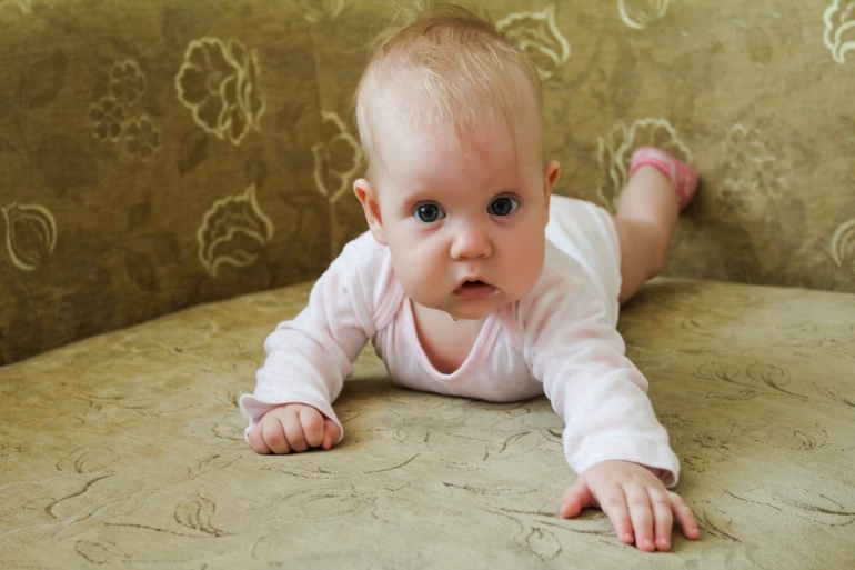 На сегодняшний день Есения лентяйка! :))) Я очень жду, что она начнет вставать на вытянутые ручки, но фиг... За то шикарно поднимает попу ноги под себя подгребает и вертит пятой точкой!