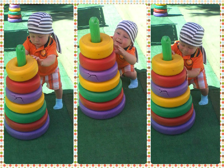В остальном учится по-немногу.Захар очень неусидчивый,терпения у него мало,потому обучение идёт медленно.Кольца пирамидки научился нанизывать наконец,но пирамиду все равно не собирает,для этого нужно усердие,а у него этого нет.Наденет одно кольцо - уйдёт играть горшком.Вернётся - первое снимет,наденет другое и опять уползает.Такая же песня со всем.Например,собирает ракушки в баночку (тоже наконец-то понял как).Две.В смысле - две ракушки.И всё. Ему нужно,чтобы можно было трясти баночкой и она гремела,для этого двух достаточно.Дальше сидеть и собирать не будет.