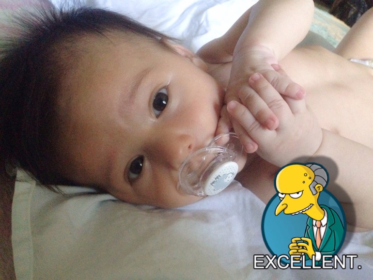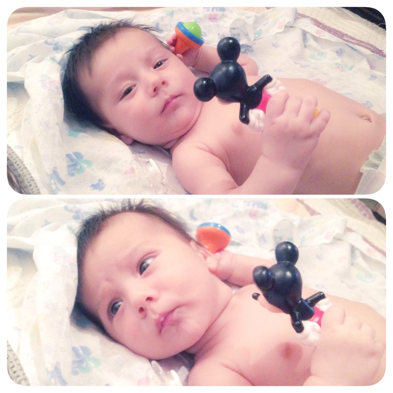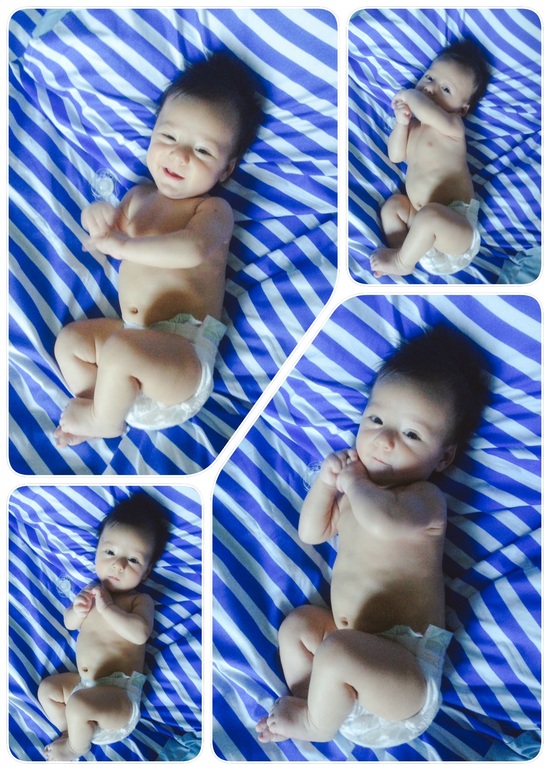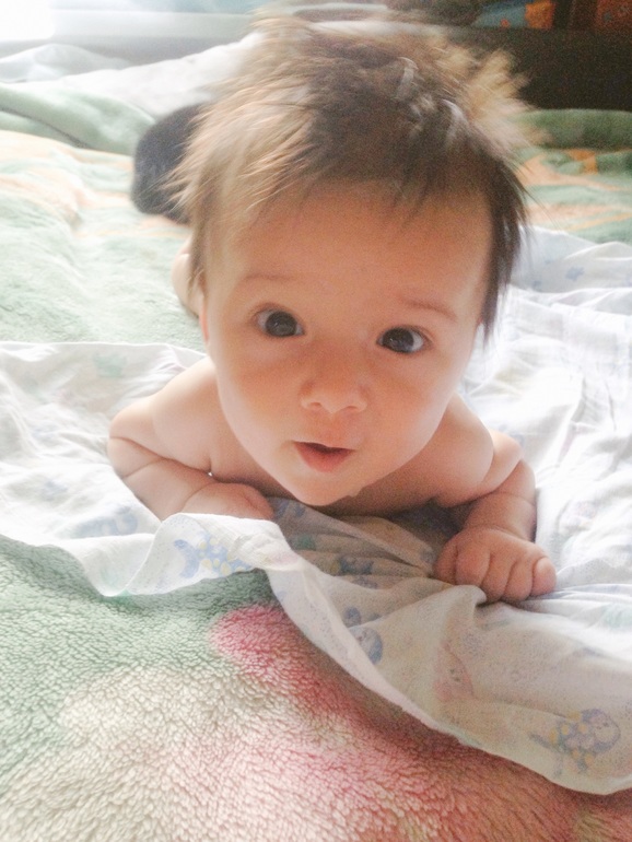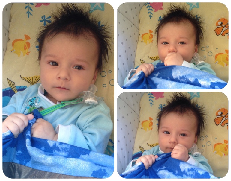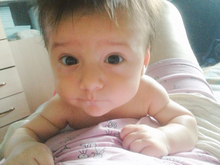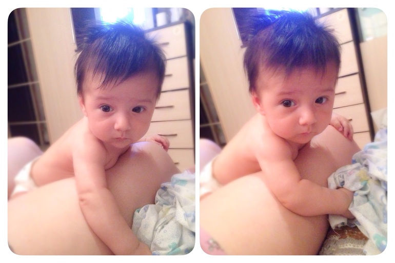 Очень много, что произошло за это время. Мой малыш стал смеяться в голос, правда пока редко, только когда его щекочешь или зацеловываешь щечки. Но это ни с чем не сравнимые моменты!) Еще очень комично он выглядит, когда видит грудь) Начинает размахивать руками-ногами, открывает широко рот и глаза и ахает от нетерпения))) У невролога всплыл вдруг гипертонус по правой стороне, сделали массаж, вроде стало получше. А через неделю после него Владюха сам перевернулся на живот (пока только через левый бок), запихнул обратно в рот выпавшую соску и начал хватать и перекладывать из одной руки в другую все, что не предложишь. Так же стали замечать, что игрушки, мобиль и коврик развивающийся совсем не привлекают мелкого. Только люди, лица. На коврике может полежать от силы минут 10, потом кривит губы и хнычит - надоело. Мобиль привлекает на пару минут. Игрушки-погремушки вообще никак, в руку возьмет, в другую переложит и кинет на кровать. Зато общаться может пока кушать не захочет, главное болтай с ним без умолку. Да и вообще, мамин сынок растет. Раньше я думала, моя мама преувеличивает, говоря, что Влад хорошо себя ведет у нее на ручках только если я рядом. А теперь и муж так же говорит, и крестная наша, и подруга. Да и я замечаю, что сидя у кого-нибудь на руках, Владюха постоянно контролирует мое присутствие) Эх, чую, когда ползать начнет в туалет за мной приползать будет, как это было у подруги. А так же, все говорят, что сын с каждым днем становится все больше похож на меня)))