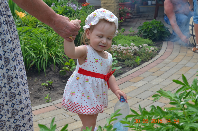 Отметили годик в день рождения с родными узким кругом, а 4 июля(суббота, плюс в этот день нас выписывали) отмечали на даче около реки. Прошло все здорово и весело, но Маргоша вела свой обычный день, ей пока фиалетово годик или два