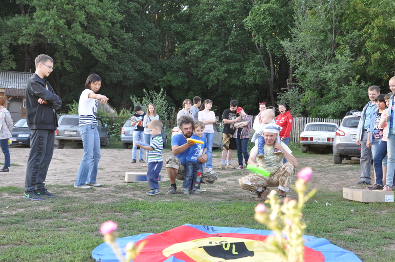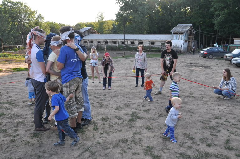 Потом у нас были активные игры, типа - папы с закрытыми глазами должны найти своих детей на ощупь..