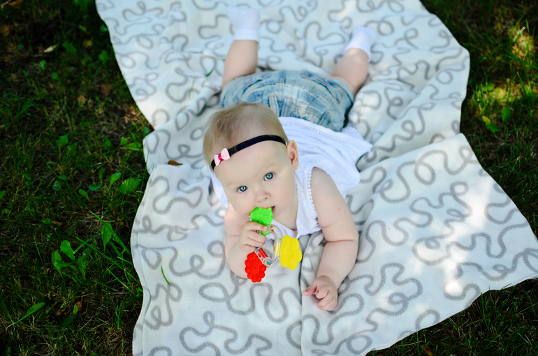 С собой мне приходится брать целый мешок реквизита: плед, поющие мелкие игрушки, просто мелкие игрушки для погружения в рот,воду, платочек и тому прочие прибамбасы для развлечения и отвлечения)
