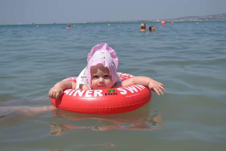 Отдельно напишу про круг - мега вещь! Стоит конечно дорого, но мы с ним каждый день были на море и в аквапарк с ним ходили. Там мы произвели фурор))) Народ такого не видывал, такую кроху и которая сама рассекает по всему бассейну. А она в нем реально плавала, ногами отталкивалась и плыла))) А поскольку мы компактные, все принимали нас за четырехмесячных)))