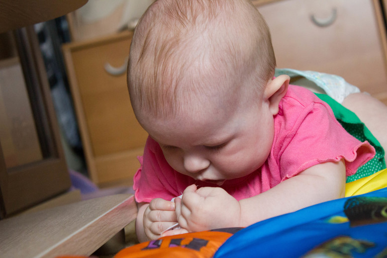 Ходит вдоль стеночки (в основном, конечно, это вдоль диванных подушек, потому что иногда, как я уже написала, она может упасть на спинку). На месте сидит редко, когда играется с какой-нибудь новой игрушкой или давно забытой старой, попыхтит, поизучает, попробует на зуб - и лезет ко мне, держится за плечо или за волосы и встаёт.