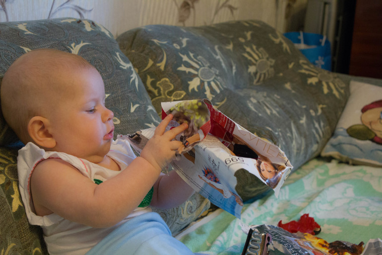 А, да! До одури любит всякие мелкие предметы (ювелир, блин, растёт): чем меньше - тем лучше. Может ковыряться и сопеть, увидев, например, пуговицу у меня на бриджах. А сама любит "читать газету"... ну как: берёт какую-нить брошюру, с хохотом разрывает на мелкие кусочки и тянет в рот, смокчет и тямкает, издаёт смешные звуки. Один раз не углядела - съела маленькую бумажку (не успела залезть ей в рот, как она её проглотила).