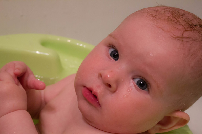 Водичку уже узнаёт и любит посидеть, побить руками по воде (правда, недолго, но и на том спасибо, а то ещё месяц назад купаться было пыткой).