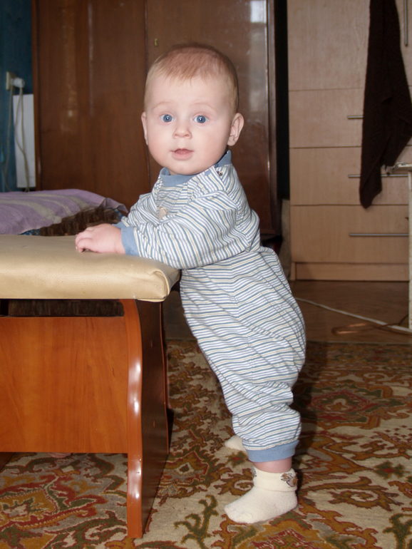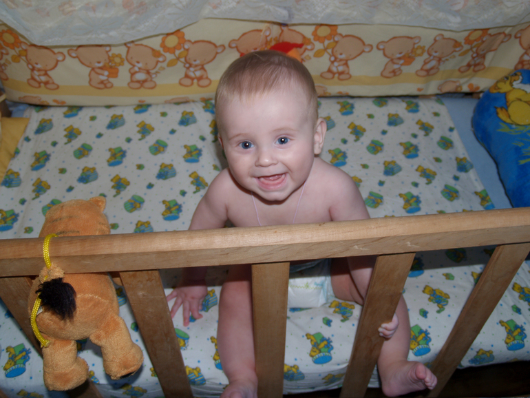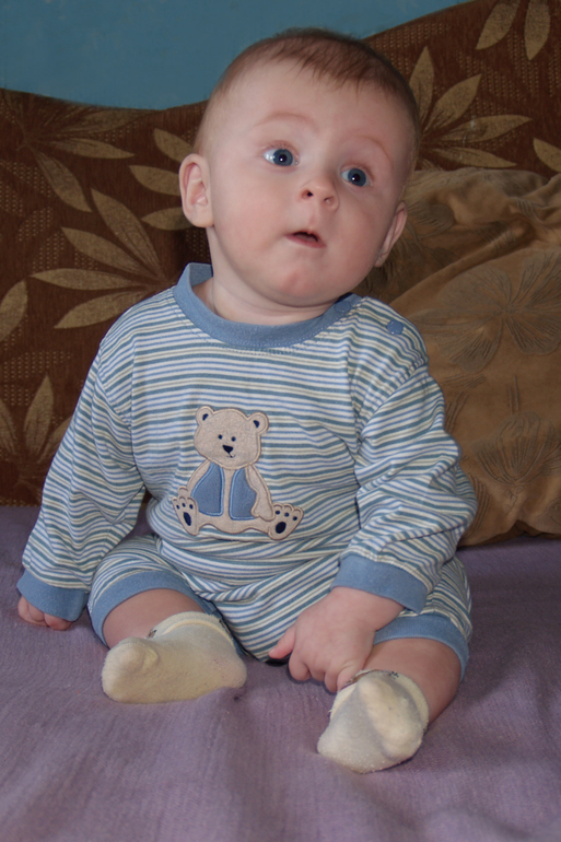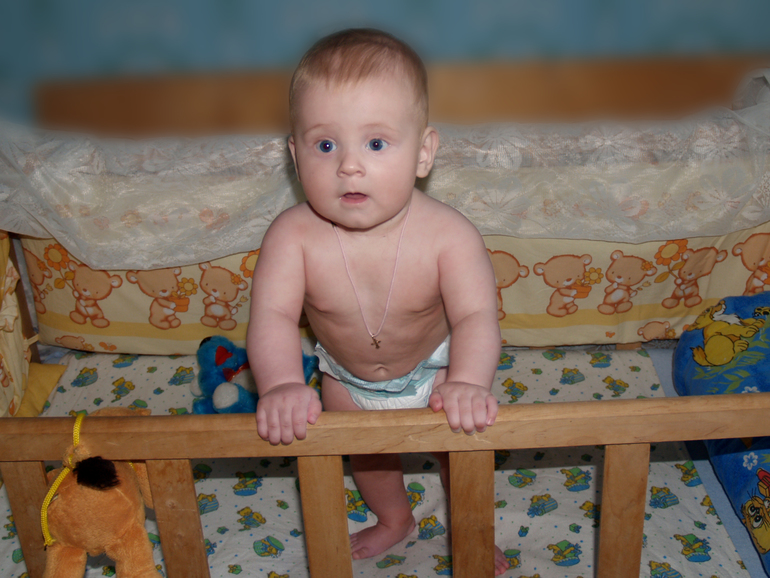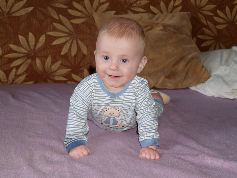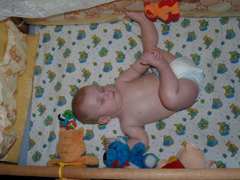 Но на четвереньки встать пока не получается, хотя мы уже давно стараемся(( Соответственно и ползать мы еще не умеем, только по-пластунски. Старшая дочка в его возрасте уже полноценно ползала. Главное, что у нас произошло после массажа - у нас исчезла любимая сторона и лежим мы теперь на разных сторонах! Боюсь, как бы не поздно, голова у нас еще достаточно кривовата. Как мы только не боролись с любимой стороной - все было без толку. С недавних пор мне пришла мысль класть его спать на животе, чтобы дальше не искривлялась затылочная сторона. То есть я клала его как обычно, а когда засыпал, переворачивала на живот. После нескольких дней экспериментов, ему так понравилось спать на животе, что когда я его укладываю в кроватку, он сам переворачивается и засыпает на животе. Ночью не переворачивается на спину, только головой ворочает. Кстати, и днем мы почти все время валяемся на животе, а ведь раньше не любили)) Очень надеюсь, что голова еще выровняется...