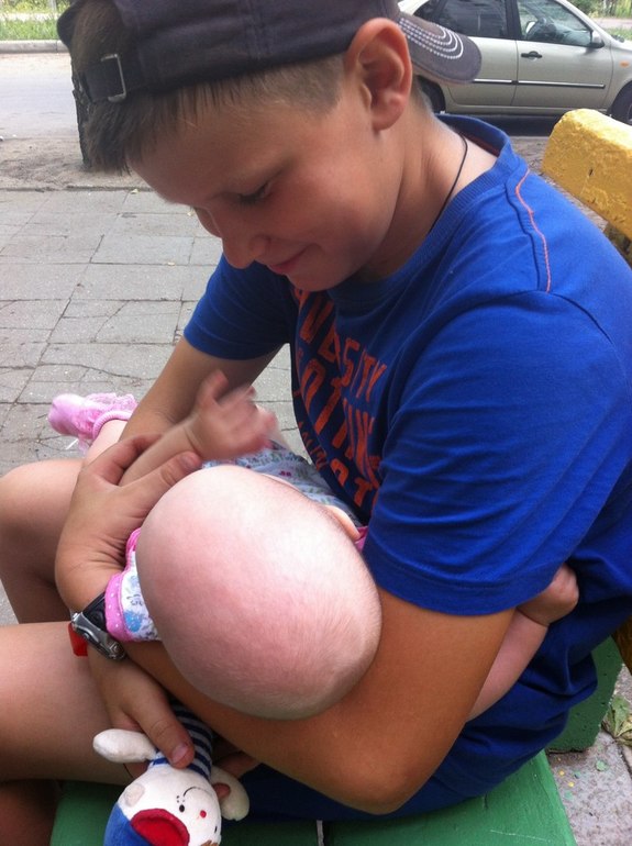 Ариночка, стала уже совсем-совсем большой и взрослой девочкой!:) Она очень улыбчивая, быстро идущая на контакт с людьми кроха. Очень любит детишек любого возраста, прям тянется к ним, смеётся с ними, наблюдает за ними!:) Поэтому нянек у нас хоть отбавляй! Все хотят её потискать, потаскать, поиграть а ей и нравится!:) Да и я не против, хоть руки отдыхают, да что скрывать, не только руки!:)