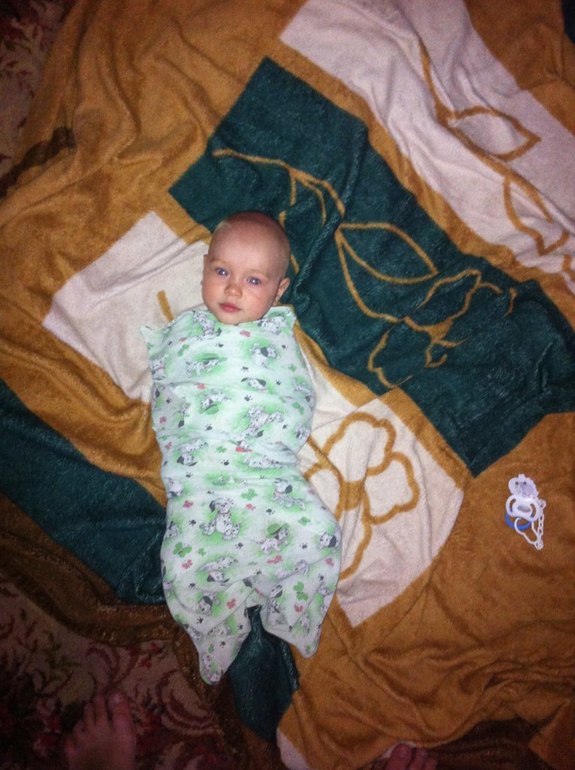 Как например, пока я готовила ужин, Стас решил запеленать её, она дико этого не любит, а тут тишина полнейшая была, не писка, прихожу с кухни, а там лежит блин, комочек!:) Короче папа с дочкой развлекаются как могут, и после того я удивляюсь, а у меня точно один ребёнок?:)