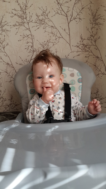 Шагнули мы в 9тый месяц жизни таки с новой умелкой. Пополз по пластунски, точнее как раненый солдат)))) Сын рад, а мама счастлива как слон!))))) Но вместе с ней ко мне пришло ощущение, что Глеб не очень то рад, что я его мама и пытается от меня уползти. Как только я отывернусь он тут же "бросками кобры" предательски движется к входной двери))))) Устала я ждать пока сын сядет сам (да бросьте в меня тапок) и вчера был преобретен стульчик для кормления, и теперь мы едим как взрослые люди))) Спинка, естественно под наклоном, но мы подтягиваемся и садимся, но не на долго, потом валится на бок. Начали активно вводить прикорм, который притормозился из-за непонятной сральни, описанной выше, которая продолжалась 2,5 недели, а потом еще неделю мы ее лечили. Кашу Глебыч уже давно уплетает за милу душу, сейчас пробуем броколли, первые 2 дня мое милое личико корчилось в таких гриммасах, что мне казалось, что в ребенка вселился демон))))) Но сейчас уплетает с удовольствием, готовлю сама. На подходе кабачок. Он следующий. Так же пробуем компот. Очень нравится.
