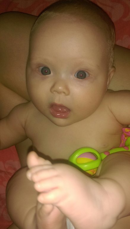 В поликлинику мы не ходили и не пойдем до самого полугодия,поэтому рост/вес не знаю,ну малышка довольно тяжелая уже,об этом говорят мои руки и спина:( теперь моя девочка не хочет мирно лежать на кровати,ей нужно всё и вся:))обожает,когда носим её по квартире,любимое место,ванная,она с таким удовольствием рассматривает крема,шампуни и т.д))