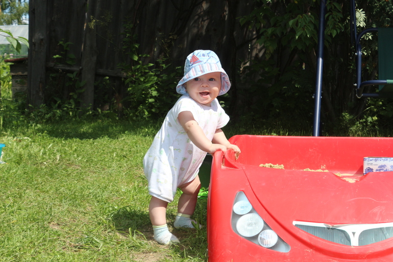 Сел Миша в 6,5 месяцев. В семь (после поездки на поезде) Миша пополз (сразу быстро, как таракан)))))). В семь месяцев и несколько дней Миша встал у опоры в кроватке. Теперь Миша носится на коленках по всей квартире, встаёт там, где это возможно. сидя играет в игрушки. В бассейне Миша умеет правильно нырять, но проплывать сам ещё побаивается.