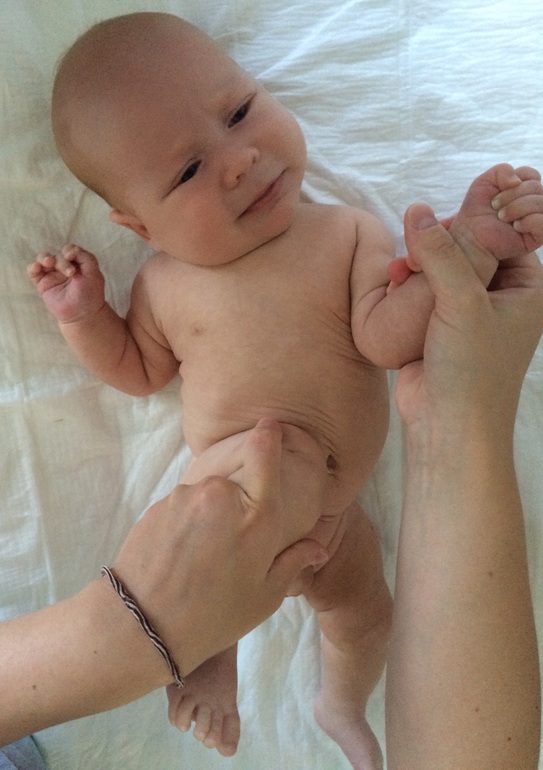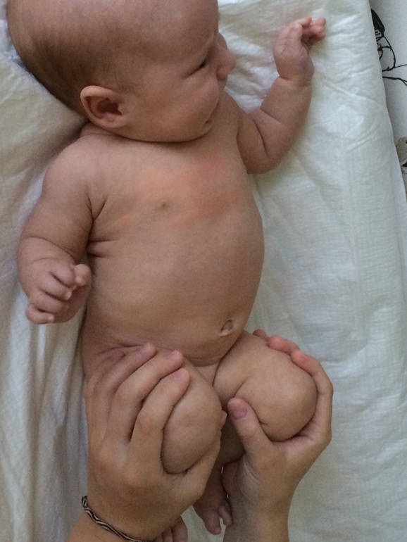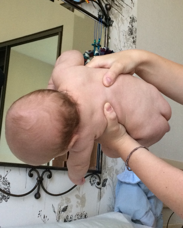 Берем чуть прижатые к животу ножки ребенка за коленки и ляжки (Гриша лежит ровно на спинке - неудачное фото):
