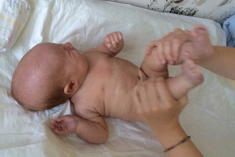 Упражнения мы делаем ежедневно по несколько раз, обычно во время смены подгуза. В идеале делается 10 повторений каждого. Подчеркну особо - никакого насилия! Если ребенок не хочет, отнимает у вас с силой ручку или ножку, плачет во время упражнения и по-всякому беспокоится, гимнастику нужно прекратить немедленно, отложив до лучших времен.