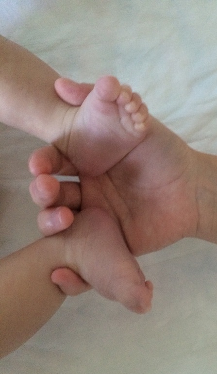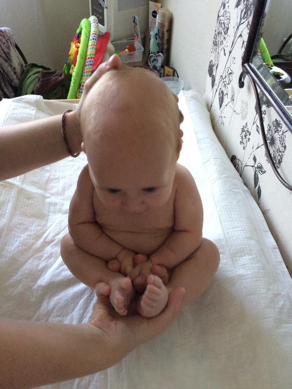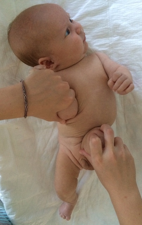 Берем щиколотки малыша и вкладываем их в свою ладонь вот так: