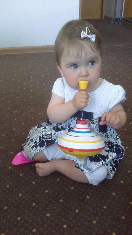 Пока Варя не пошла, только встает, с каждым разом все увереннее и увереннее. Ходит только вокруг опоры, ничего - все впереди. Зубов у нас три, четвертый на подходе, уже светится через десну. Сегодня завязала первый хвостик, чисто для фото, ибо завязывать особо нечего))). Вес и рост пока не знаю, т. к. еще не ходили на прием.