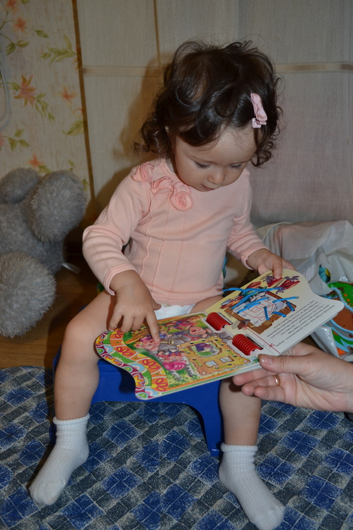 Научилась собирать пирамиду, даже не собирать, а нанизывать кольца на стержень, стала четче и правильней показывать пальчиком животных на картинке, никогда не ошибается показать -мячик, кошку, собаку, часы. Бабушку, дедушку и внучку часто путает между собой:-). Книжки продолжает любить, игрушки не интересуют, если только чужие:-), больше нравиться у няни в комнате что нибудь слямзить -например косметику, или сумку с журналами, и все раскидать. Стала злиться и драться, может со злостью щипать, аж трястись (это они с Яной так отношения выясняют, кто бардак в комнате навел), ругаю за это. А вообще дома постоянный беспорядок, только одно уберешь-другое раскидали:-), ходишь по квартире как по минному полю, я то привыкла, а муж как слон, только и слышно- ой, ай, эх блин,чёт раздавил:-), сначала ходила весь день, подбирала, а..., теперь махнула рукой, вечером спать Евгешеньку уложу, и тогда порядок наводим.И так из-зо дня в день:-).