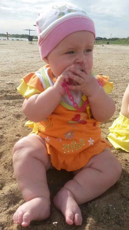И в последний жаркий день съездили на пляж. Полина в первый раз потрогала песочек, она была в диком восторге от него