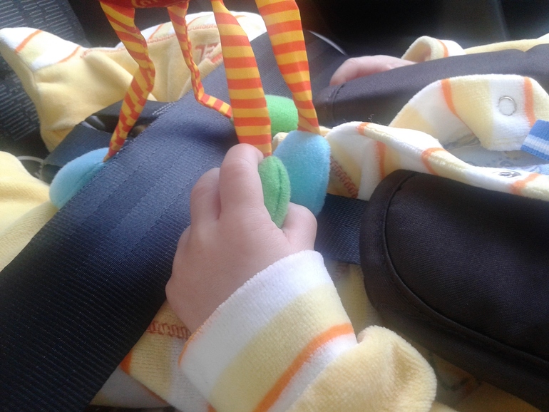 - Держим игрушки-погремушки. Дали подержать прорезыватель - он был воспринят как продолжение кулака и отправлен в рот )))