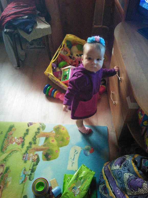 Что умеем? Сидеть, ползать как метеор на четвереньках, вставать у опоры и стоять у неё. Иногда, когда увлечется игрушкой, может и постоять без рук минуту-две. Потом спохватывается и хватается, за что-нить. У опоры ходим, а на улице ходит, держась за руки. Особенно любит ступеньки, но т.к. большинство ступенек нам пока высоки, это умение пока не особо развивается.