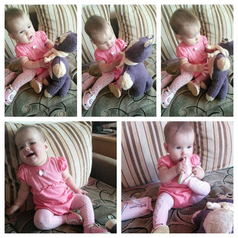 ЗнакомимсяЯ честно думала, что нам до этого как до Луны на вертолёте.... Но вот оно, 9 месяцев Каждый месяц бежит быстрее предыдущего. Дни пролетают со скоростью света. Ну да вы ли этого не знаете. В общем, нежданно негадано Олесе 9 месяцев. Вес не знаю, звезда моя воспротивилась лечь на весы. Ну где-то 8200. Рост 70 см. Зубов 3 и четвёртый на подходе. В связи с чем 9 месяцев встречаем в слюнях-соплях.