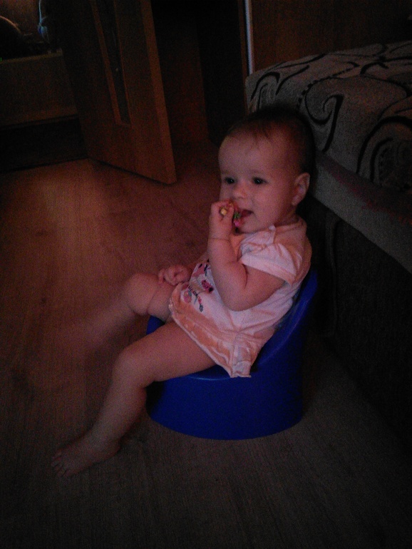 . Кстати только моя красотка стучит обо всё головой? Не случайно, а специально под ползает и давай стучать лбом или затылком.Ну что ещё периодически знакомимся с горшком. Писяем в него редко, какаем чаще. Папа наш шутит, что для пописять надо другой горшок покупать. Спим днем2 раза, в общей сложности 2-2,5 часа. Днём практически грудь не ест, только когда прикорм что называется не зашёл. Любит каши молочные, яичный желток, помидоры, груши, тыкву и морковь барочные. Постепенно начинаем есть приготовленную еду. Её ест с переменным успехом. То может сжевать впреную картошку, то отказывается совсем. Ну да ничего привыкнет. Каша сначала тоже была пыткой, а сейчас это единственная ела, в которой я уверена. Пока мясо не особо жалует. Начинаем осваивать творог и йогурт.