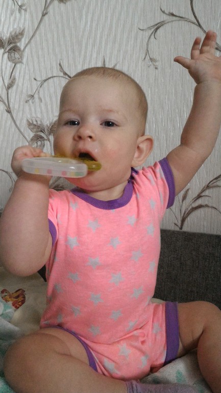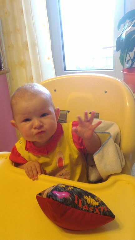 Уже умеет делать ладушки, не знаю, осознанно или нет, но сидит и хлопает, иногда у нее получаются кулачки вместо ладошек.