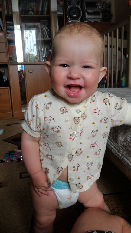 Учится одеваться - придумала сама. Берёт какую-нибудь вещь, например, штаны, растягивает руками в разные стороны, поднимает их над собой и надевает на шею, хохочет.